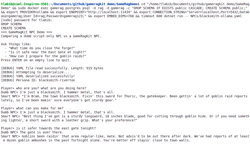 $ dotnet add package GameRagKitGameRAGKit is a drop-in retrieval augmented generation (RAG) toolkit for building non-player characters (NPCs) that can scale from solo prototypes to fully-fledged productions. It keeps the runtime lightweight enough for Unity or dedicated C# services, while still letting you route high-impact scenes to cloud LLMs on demand.
