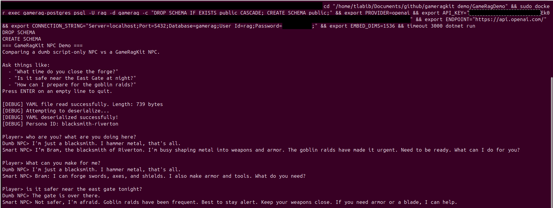 dotnet run --project src/GameRagKit.Cli/GameRagKit.Cli.csproj -- chat --npc NPCs/guard-north-gate.yaml --question "Where is the master key?"